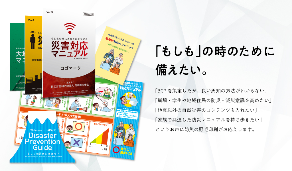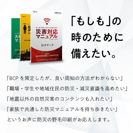 | 学校、自治体でご導入いただける災害対応マニュアル(オーダーメイド版)をはじめ、外国人留学生・職員向けの災害時対応マニュアル、発達障がいのある人たちへの緊急時対応ハンドブックをご提供しています。 |